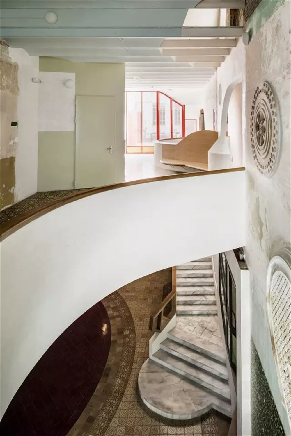 设计师通过100多份的测绘图纸,对建筑的就元素进行了编目整理,最终确定将门窗、门把手和瓷砖等元素进行完整拆解,再重新应用与新项目当中。包括建筑原有的马赛克瓷砖、斑驳的墙面,以及地砖,都进行拆解和再利用,使原本老旧的元素在重复利用的过程中得到重生。