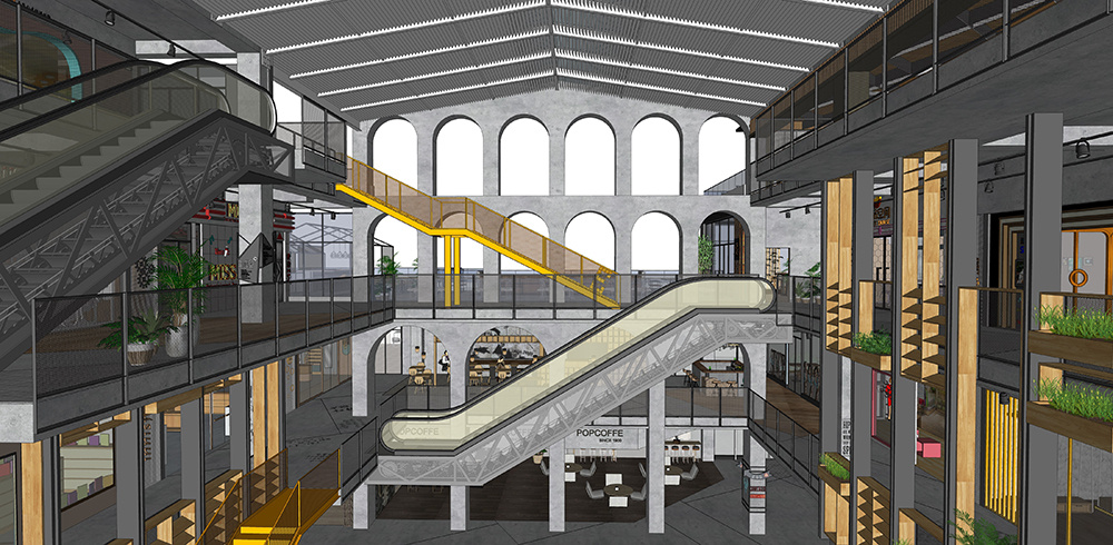考虑到项目建筑半开放式的特征,设计师大胆地从文艺复兴时期中提取出廊拱结构应用到商场中。日光中穿梭于廊拱下,人与空间共同构成了一幅静美的剪影画,阳光洒落,在变幻的光线中整个空间呈现出美妙的光影意象,这是在任何一个商场所不能见到的。而这一独创性的设计也刷新了客户对商场设计的认知,其独具一格的魅力也让客户从最初的诧异转变到后来的认可和坚持。