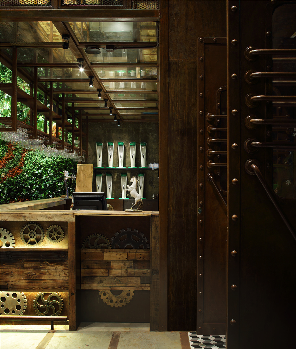 暗沉实木加上金属齿轮打造复古厚重的吧台,剥离感强烈的木材、做旧的黄铜质感、暗黑金属框架、皮革材质的卡座,空间的每一处都充斥着满满的工业复古感,高达5.8米的巨大绿植墙带来原始生态感,原来用餐的空间也可以这么酷。